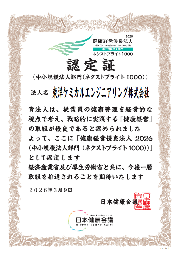 東洋ケミカルエンジニアリング株式会社は、このたび、経済産業省および日本健康会議が共同で認定する「健康経営優良法人2026(中小規模法人部門)」において、「ネクストブライト1000」の認定を受けましたのでお知らせいたします。